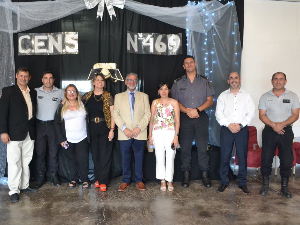 En el acto de entrega de los certificados a los graduados, estuvieron presentes la Inspectora distrital de Merlo Verónica Ramírez, el director del CENS Nº 469 Rafael Díaz y el cuerpo docente.