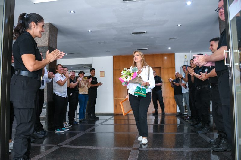 En la jornada, autoridades y compañeros de trabajo realizaron un cordón de honor para homenajearla y le obsequiaron un diploma, algunos presentes y muchos aplausos en reconocimiento a su trayectoria laboral.