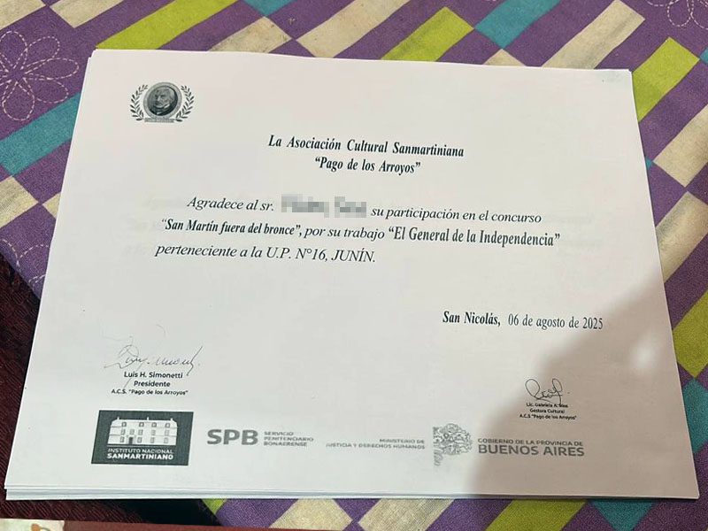 Junín, 08/09/25.- Este lunes 8 de septiembre, personas privadas de la libertad que participan del programa Pabellones Literarios para la Libertad en la Unidad 16 de Junín, recibieron los certificados de participación en el concurso de poesías «San Martín fuera del Bronce» que se desarrolló en ese ámbito.