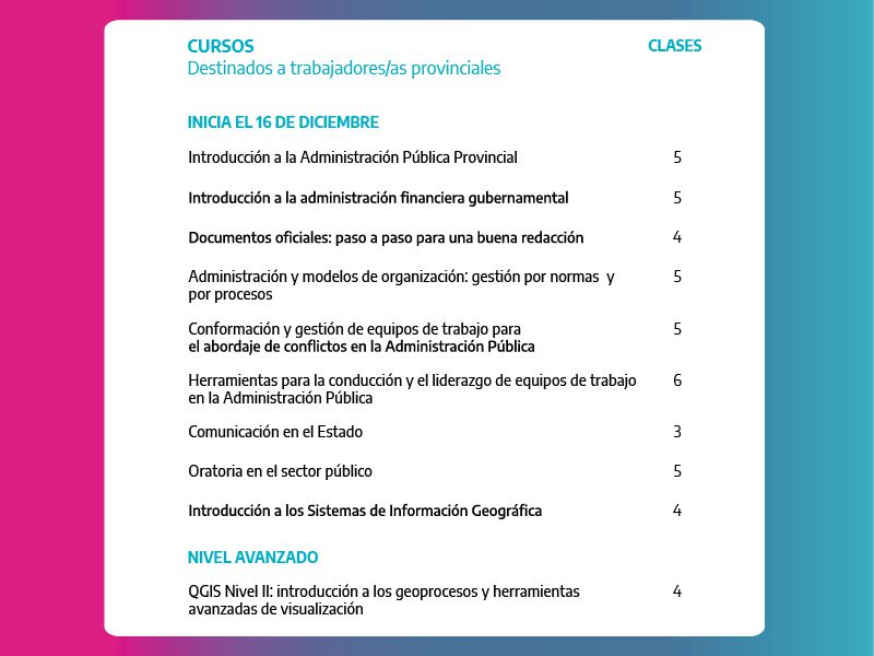 Los cursos que apuntan a la Administración son: Introducción a la Administración Pública Provincial, Documentos Oficiales: paso a paso para una buena Redacción, Administración y Modelos de Organización: gestión por normas y por procesos, Conformación y Gestión de Equipos de trabajo para el abordaje de Conflictos en la Administración Pública y Herramientas para la conducción y el Liderazgo de Equipos de Trabajo en la Administración Pública, entre otros.