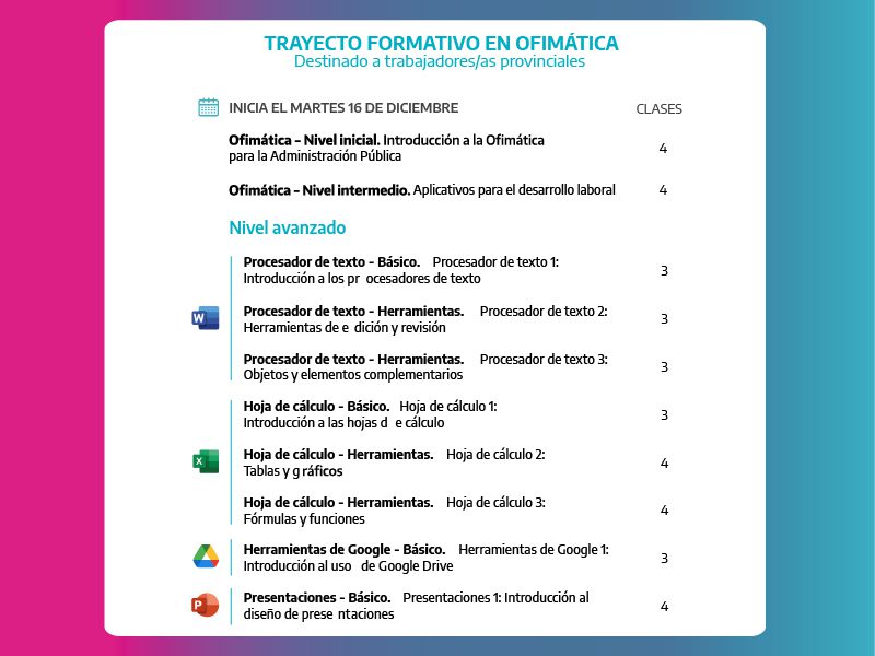 Los trayectos formativos que capacitan en herramientas informáticas son: Ofimática – Nivel inicial. Introducción a la Ofimática para la Administración Pública Ofimática – Nivel intermedio. Aplicativos para el desarrollo laboral y Nivel Avanzado en Procesador de texto: herramientas de edición y revisión; Objetos y elementos complementarios; Hoja de cálculo: Introducción a las hojas de cálculo, Herramientas, Tablas y gráficos y Fórmulas y funciones; Herramientas de Google; Introducción al uso de Google Drive, y Presentaciones, entre otros.