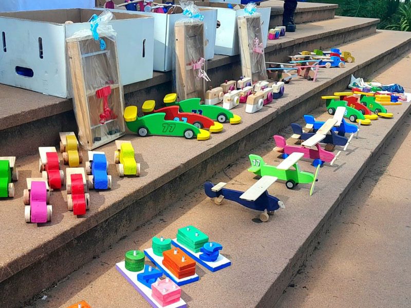 La entrega se concretó este martes y constó exactamente de 317 juguetes de madera reciclada: 56 cámaras, 50 avioncitos, 48 camioncitos, 46 juegos de ta te ti, 36 juegos de memoria, 35 juegos de encastre, 28 tejos de mesa, 10 autitos, cinco juegos de dominó y tres yengas, todos realizados con materiales reciclados, promoviendo valores de solidaridad, trabajo y cuidado del ambiente.