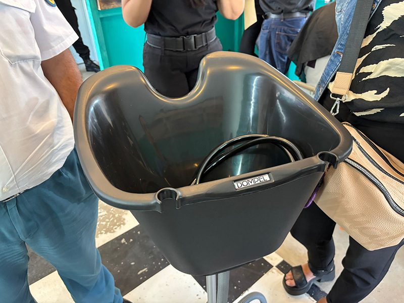 Entre los elementos incorporados se destacan atomizadores, capas de corte, cepillos, sacapelos de peluquería, delantales, un lavacabeza portátil, máquinas de afeitar profesionales, máquinas de corte y patilleras, kits de peines, un sillón de corte y diversas tijeras profesionales.
