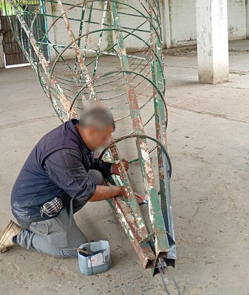 El árbol, fabricado en la sección Talleres, está confeccionado íntegramente de fierro estructural y posee una malla de alambre que cubre toda la estructura.