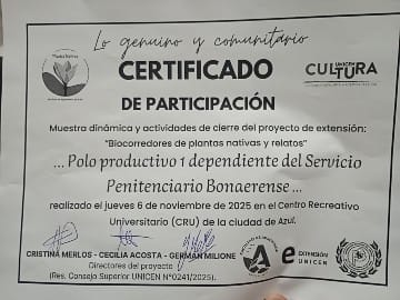 Azul, 07/11/25.- En el día de ayer la producción botánica realizada por el personal del Polo Productivo Complejo Centro Zona Norte participó junto con la Facultad de Agronomía de la UNICEN, de un stand de la muestra “Biocorredores de plantas nativas y relatos” realizada en el Centro Recreativo Universitario de la ciudad de Azul.