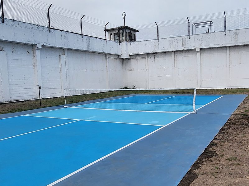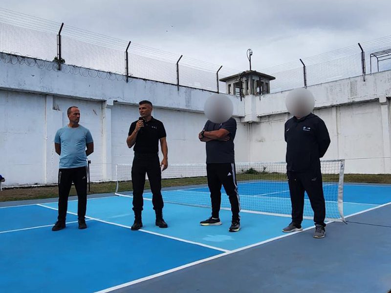 Posteriormente, la comitiva se trasladó al predio deportivo, donde tuvo lugar la inauguración de una cancha de pickleball, un deporte de paleta que desde hace un tiempo se ha incorporado como una de las actividades regulares que las personas privadas de libertad practican como parte de las propuestas impulsadas por el equipo profesional de deportes del establecimiento.